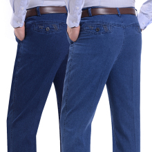 中老年牛仔裤男弹力高腰直筒长裤中年男士夏季薄款爸爸男装男裤子