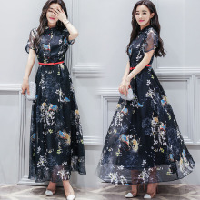2017新款优雅仙女裙大摆裙印花修身雪纺连衣裙女夏中长款碎花长裙