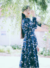 蜜搭/繁花/纯棉碎花中长款大摆裙女 文艺复古长袖连衣裙 森女秋