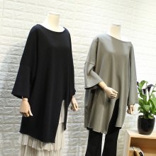 菲尔丹 一字领落肩袖不规则开叉t恤女 韩版大码中长款上衣春71067