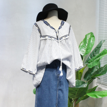 菲尔丹 民族风刺绣V领系带装饰细条纹衫女 韩版春季宽松上衣5181