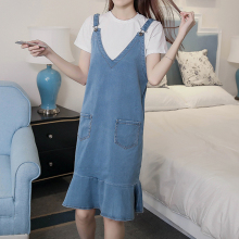 夏季新款韩版宽松显瘦小清新荷叶边鱼尾裙中长款牛仔吊带连衣裙女