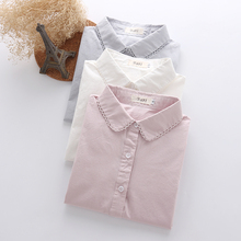 韩版春装学院风休闲猫头刺绣衬衫女纯色牛津纺翻领长袖打底白衬衣
