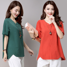 文艺复古棉麻短袖T恤女2017夏季宽松大码V领纯色百搭体恤亚麻上衣