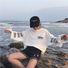 夏季新款2017时尚百搭字母印花韩版宽松袖口系带长袖T恤女上衣