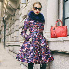 欧洲站2016冬装新款潮狐狸毛领印花轻薄羽绒服女中长款过膝外套