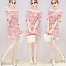 小雪原创2017夏装新款韩版女装一字领裙子收腰显瘦格子连衣裙女潮