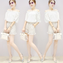 小雪原创2017夏季新款韩版休闲蕾丝上衣+高腰阔腿裤两件套女套装
