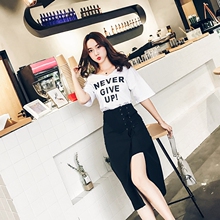 2017夏装新套装V领字母漏肩短袖T恤女高腰绑带开叉半身裙两件套潮