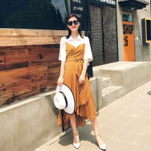 夏装高腰系带撞色半身裙套装女翻领衬衫裙不规则下摆连衣裙两件套