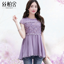 大码雪纺衫短袖女夏装丝柏舍2017新款宽松显瘦刺绣蕾丝衫S62A0411
