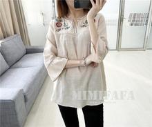 7022222春夏复古舒适简约文艺范儿刺绣喇叭袖棉麻娃娃衫女