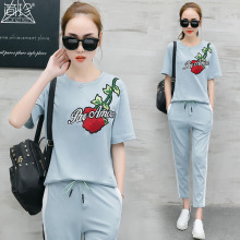 2017夏装新款韩范休闲运动套装女气质显瘦短袖玫瑰刺绣长裤两件套