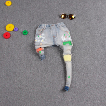 啦芙莱新款童装 春秋儿童彩漆补丁牛仔裤 男女宝宝韩版修身单裤