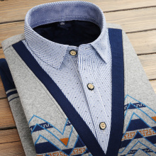 曼卡绒男士保暖衬衫冬季新款加绒加厚针织假两件时尚休闲保暖衬衣