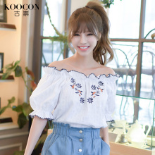 古崇2017夏季新品白色一字领衬衫女绣花露肩衬衣蕾丝上衣短袖小衫
