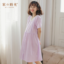 家时光花边格纹孕妇哺乳睡衣春夏季月子服薄款产后吸汗纯棉喂奶衣