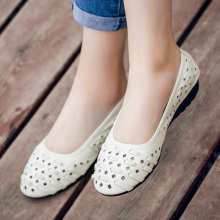秋季真皮软底平跟防滑镂空洞洞孕妇妈妈鞋舒适中老年圆头浅口女鞋