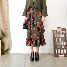 春装韩版高腰显瘦复古印花荷叶边半身裙女中长款A字裙拼接蛋糕裙