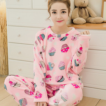 韩版秋冬可爱女士加厚珊瑚绒睡衣秋天圆领套头法兰绒家居服套装