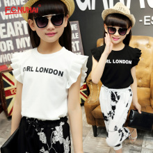 FC女孩2017夏装新款中大童韩版短袖七分裤女童字母t恤阔腿裤套装