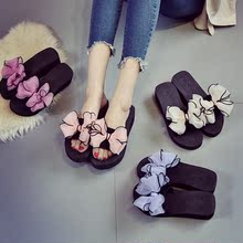 2017新款沙滩拖鞋女时尚外穿中跟厚底防滑蝴蝶结凉拖鞋一字拖女夏