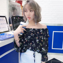 歌比姿2017夏季新款韩版宽松百搭一字肩碎花短袖上衣衬衫雪纺衫女