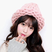帽子 女秋冬季韩版保暖卷边针织帽纯色粗棒针手工编织粗毛线帽子