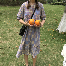 连衣裙女装2017新款韩版夏季宽松格子泡泡短袖长裙软妹小清新裙子
