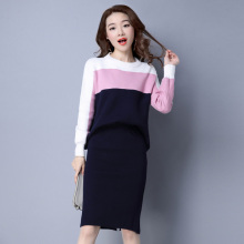 春装新款时尚套装裙撞色长袖毛衣连衣裙中长款针织包臀裙两件套女