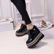 2017新款松糕厚底坡跟单鞋女鞋欧美漆皮防水台内增高系带高跟鞋