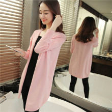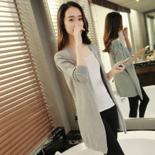 2017春装新款韩版女装V领镂空针织开衫中长款宽松薄毛衣纯色外套