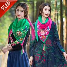 包邮民族风秋冬款保暖披肩棉麻复古中国风刺绣花流苏围巾大三角巾