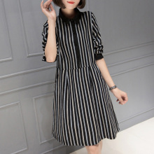 2017韩版中长款黑白条纹宽松衬衫连衣裙秋装新款翻领长袖A字裙潮
