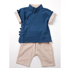 童装新品民族汉服棉麻斜领系扣素色童T恤小男孩外出服空调服