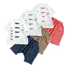 儿童唐装夏宝宝棉麻套装哈伦裤中式礼服男童短袖套装100-140cm
