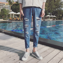日系复古街头潮牌破洞牛仔九分裤男夏季青少年学生韩版修身小脚裤
