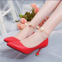 红色新娘鞋性感细跟尖头春夏天浅口百搭一字扣带女的高跟鞋8厘米