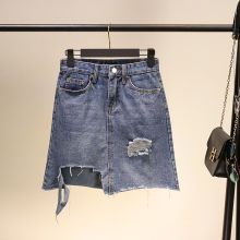 2017夏季新款高腰显瘦不规则短裙韩版撕边破洞牛仔裙A字半身裙女