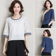 搭配阔腿裤的上衣女夏品牌新款短袖潮宽松显瘦蕾丝雪纺衫韩版短款