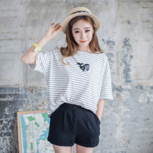 韩国印花五分细横条纹短袖T恤女宽松学生韩版半截夏季百搭半袖潮