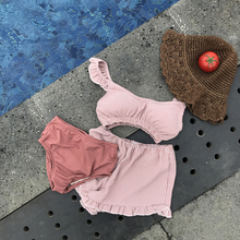 瘦竹竿自制独家设计可爱小花边泡泡格子少女感温泉度假泳衣三件套