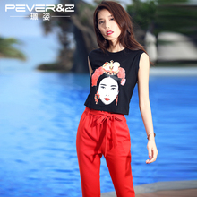 珮姿2017夏新款套装女 棉质松紧腰系带九分铅笔裤+印花T恤
