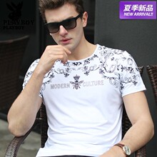 花花公子2017夏装新款短袖T恤男士时尚印花修身丝光棉体恤潮上衣