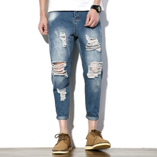 破洞九分裤男宽松潮流小脚牛仔裤韩版学生大码9分乞丐裤子潮薄款