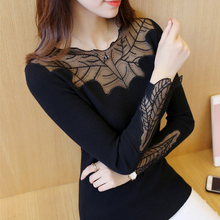2017春夏新款韩版针织衫纯色蕾丝拼接修身套头女上衣打底衫毛衣潮