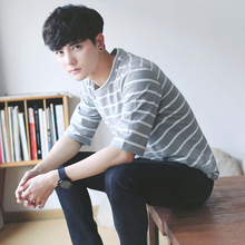 条纹T恤男夏季新款圆领条纹五分袖t恤半袖男装宽松纯棉打底衫潮男