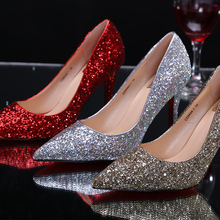 尖头一字扣高跟鞋细跟2017夏新款银色百搭亮片单鞋红色新娘婚鞋女