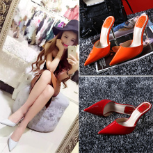 2017春新款包头半拖鞋女夏时尚外穿漆皮性感尖头细跟红色高跟凉鞋