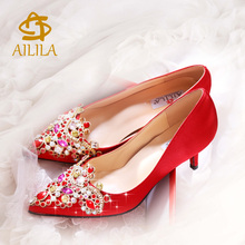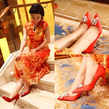 婚鞋女春季新款结婚红鞋新娘鞋配旗袍的鞋浅口细跟水钻红色高跟鞋
